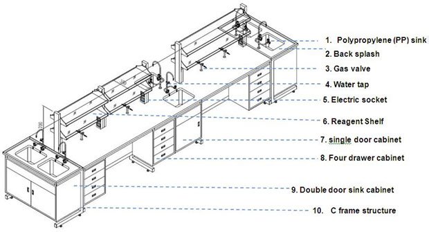 Island work tables are generally used in labs where all four sides can be utilized for working. This work table will have central service area through the middle of the table as shown in the figure